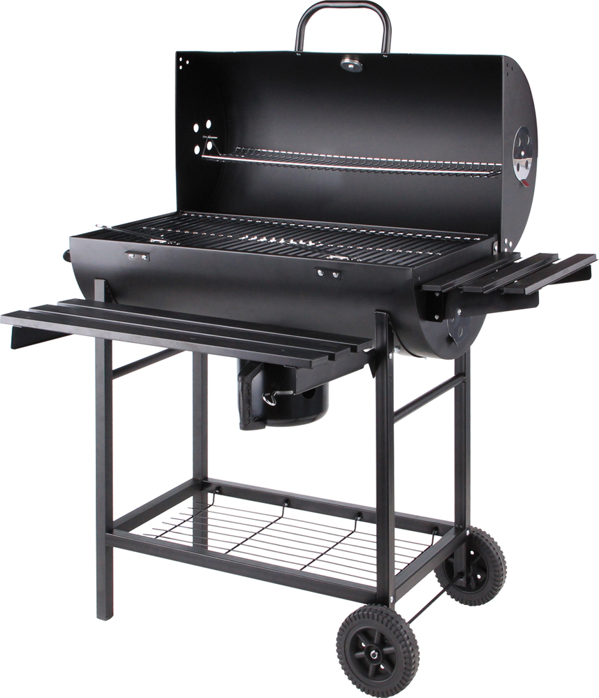 Velký zahradní gril na dřevěné uhlí, je vybaven víkem s vestavěným teploměrem, rozměrnou grilovací plochou a celou řadou odkládacích prostor.