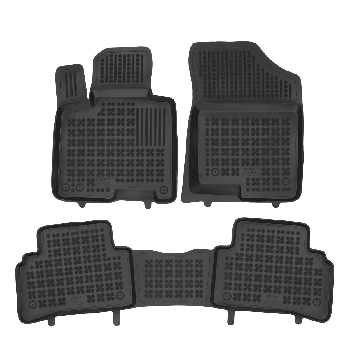 Gumové autokoberce pro vůz Hyundai Tucson. mají zvýšený okraj po celém obvodu. Výška okraje je cca 3 cm a zabraňuje tak pronikání nečistot do interiéru automobilu.