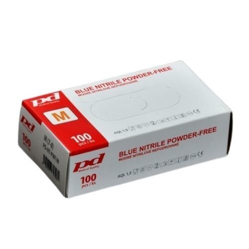 Nitrilové jednorázové vyšetřovací rukavice, nepudrované, modré, nesterilní.