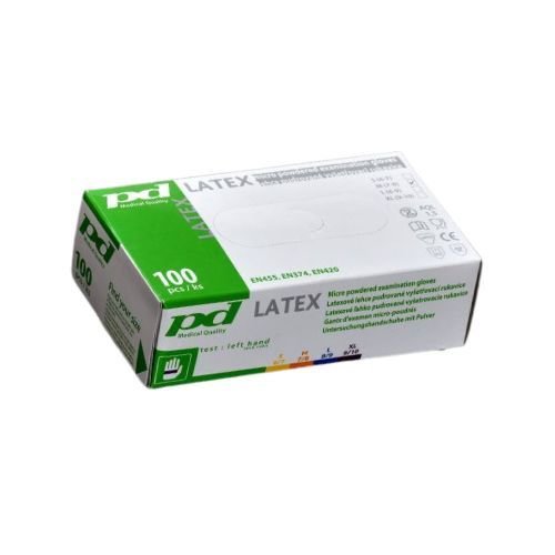 Latexové jednorázové vyšetřovací rukavice, pudrované, bílé, nesterilní.