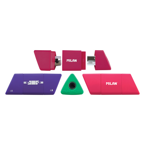 Strúhadlo MILAN Slide obojtsranné, ideálne pre klasické grafitové ceruzky a farebné pastelky. Ostrá, odolná uhlíková čepeľ. Vybavené bezpečnostným systémom, ktorý zabraňuje oddeleniu čepele od strúhadla. Vhodné pre použitie v škole aj kancelárii. V troch farbách.