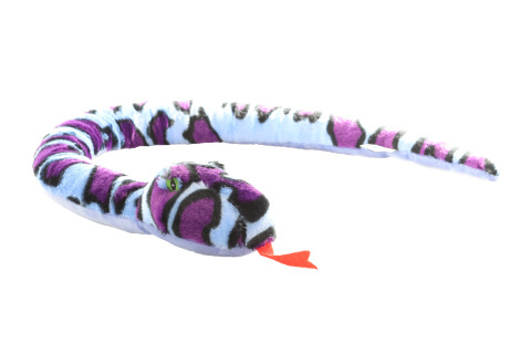 Plyšový modro-fialový had o velikosti 100 x 8 x 5 cm s rolničkou na konci. Věk 3+ číst celé