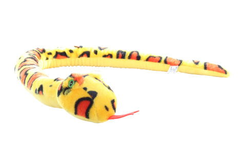 Plyšový žluto-oranžový had o velikosti 100 x 8 x 5 cm s rolničkou na konci. Věk 3+ číst celé