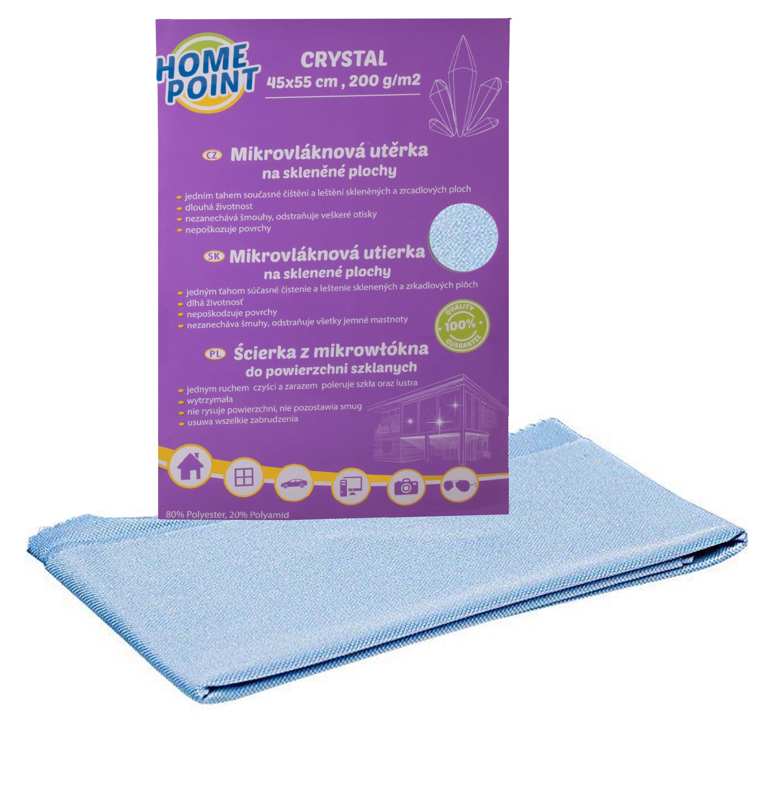 Mikrovláknová utěrka Crystal na skleněné plochy jedním tahem současně čistí a leští skleněné a zrdcadlové plochy. Má dlouhou životnost, nepoškozuje povrchy. Rozměry: 50x60 cm. Složení: 80% polyester, 20% polyamid.