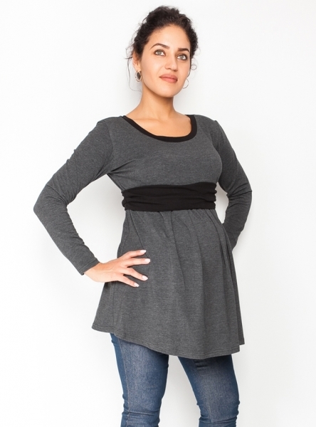 Be MaaMaa Těhotenská tunika s páskem, dlouhý rukáv Amina - grafit/pásek černý,vel. XS; XS (32-34)