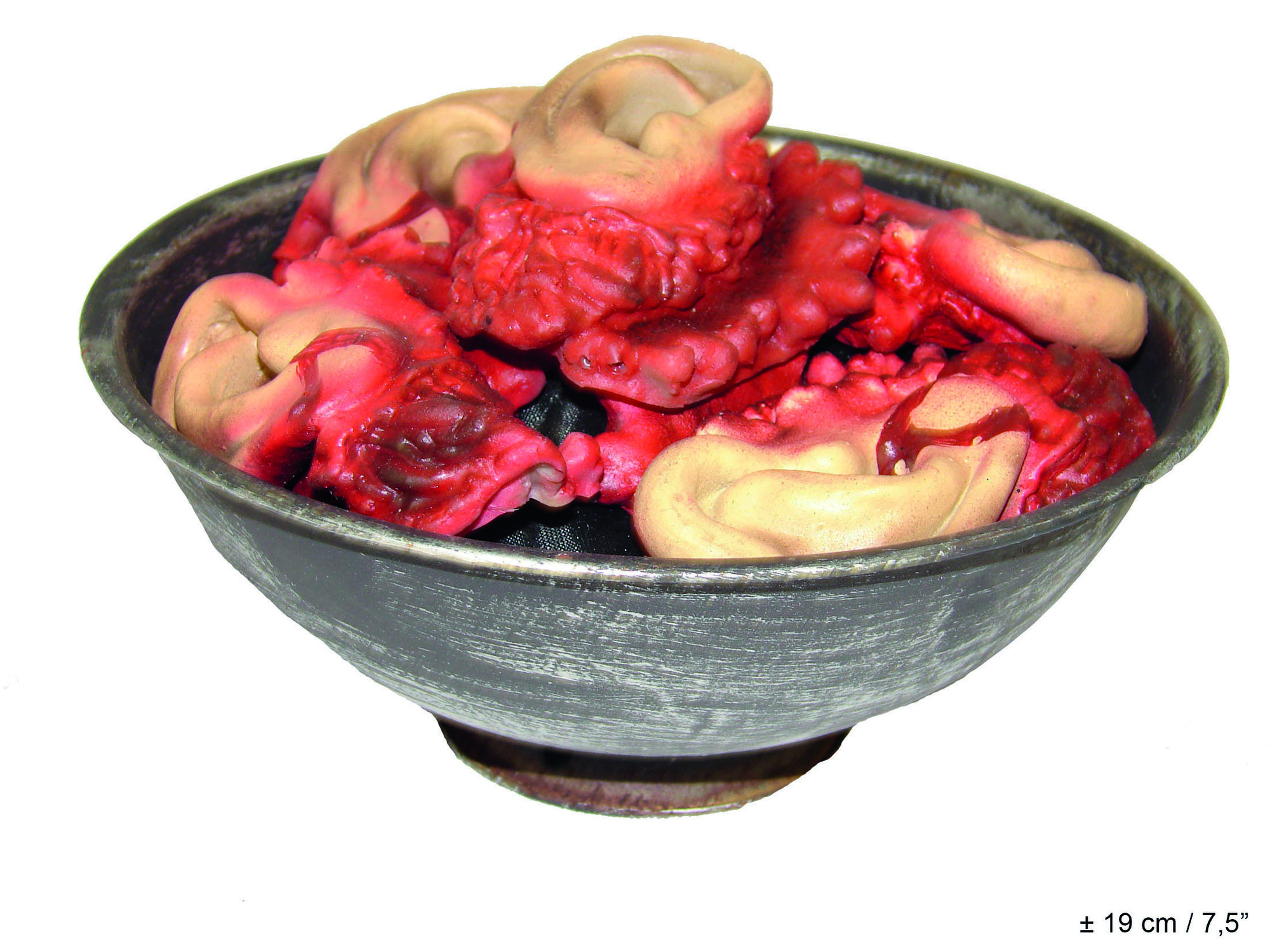 Miska s krvavýma ušima tvoří opravdu ošklivou krvavou halloweenskou dekoraci. Co může být děsivějšího než krvavé části těla na jídelním stole! Dejte mísu doprostřed halloweenského bufetu s občerstvením. S dezertní mísou s ušima se z vaší halloweenské party stane opravdová hostina i pro kanibaly.