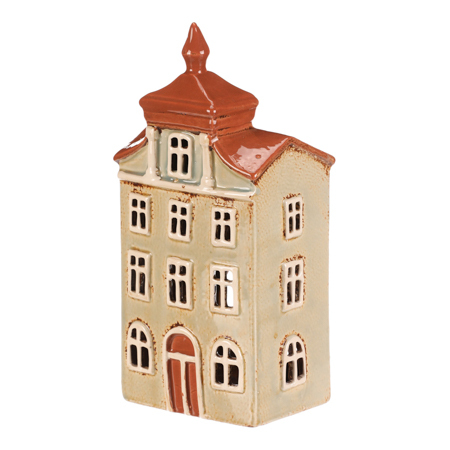 Keramický městský domek se světle zelenou fasádou a oranžovou střechou připomíná domy z malebných historických náměstí. Prostor na čajovou svíčku z něj dělá nejen krásnou dekoraci, ale i zdroj útulného světla, které bude jemně prosvítat skrze všechna okénka. Ideální dekorace pro podzimní a zimní...