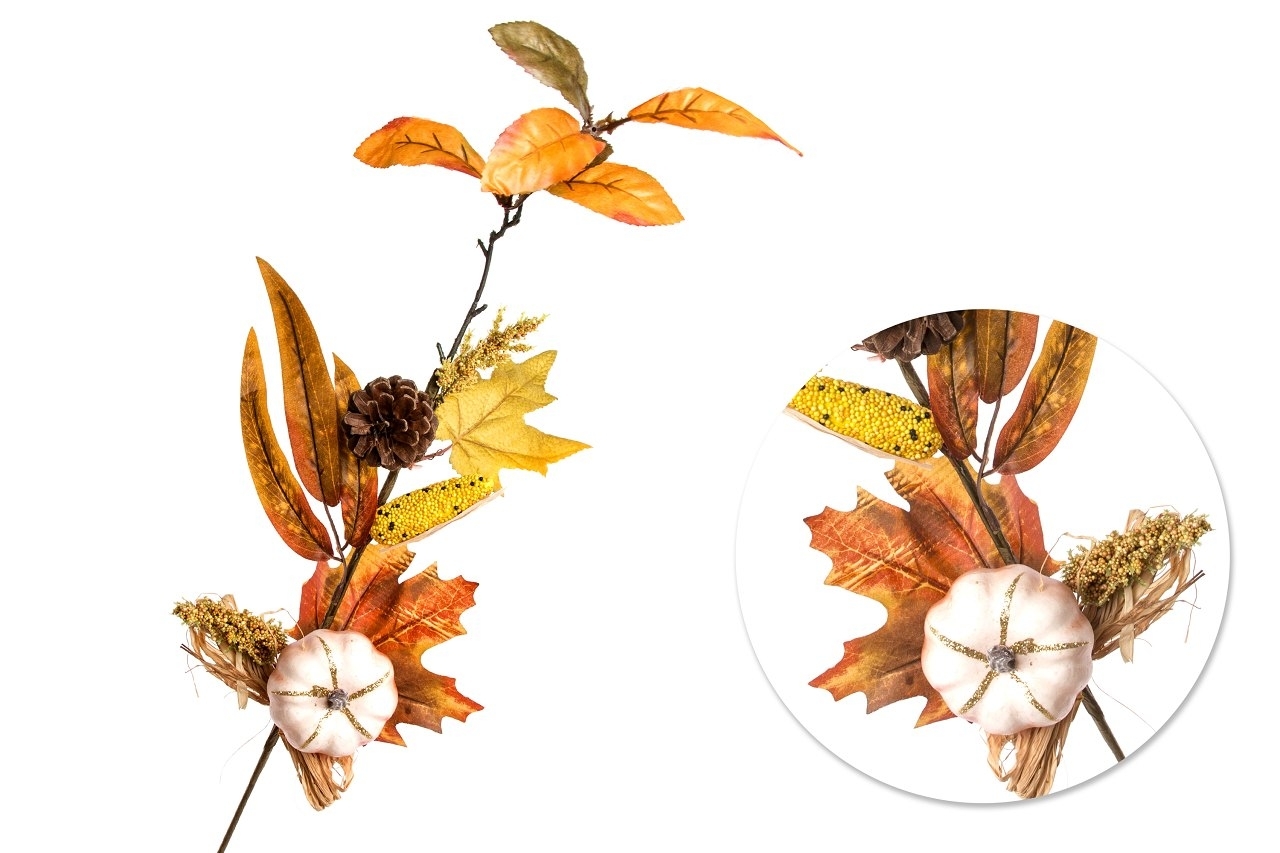 Umělá podzimní větvička s bílou dýní, listy, šiškou a jutovou stuhou.