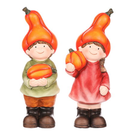 Přeneste se do pohádkového podzimního světa s našimi okouzlujícími figurkami. Dívka a chlapec, jenž mají na sobě oba oblečení s teplými a výraznými barvami, zaujmou vaše srdce a dají vašemu domovu pravý podzimní nádech. Hlavy jim navíc místo čepic zdobí vydlabané dýně. Oba ještě navíc drží jednu hezky tvarovanou dýni v rukou. Jejich roztomilý úsměv a drobná očička, jako malé korálky, září radostí a zvou vás do světa podzimních radovánek. Tyto detailně zpracované postavičky jsou jako malé poklady, které si můžete postavit na výstavní místo a těšit se z nich každý den. Nenechte si ujít příležitost přinést do svého domova barevnou podzimní atmosféru, kterou tyto figurky přinesou.