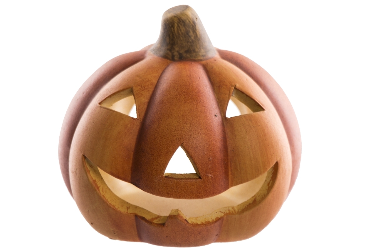 Keramický dýně s obličejem a otvorem v zadní části na čajovou svíčku.