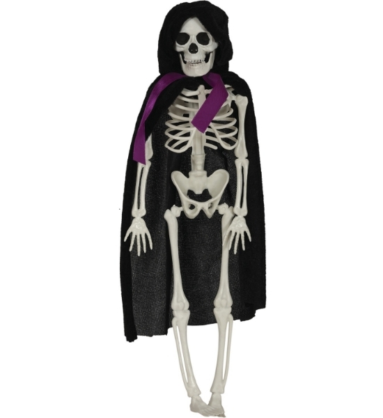 Visící kostlivec ženich je originální dekorace, která vnese do vaší halloweenské výzdoby pořádnou dávku hororové romantiky. Díky černému plášti s kapucí a fialové stuze působí jako temný ženich ze záhrobí. S výškou 43 cm je ideální k zavěšení do oken, na dveře nebo na zahradní stromy. Nejlépe vynikne v kombinaci s kostlivou nevěstou, kdy spolu vytvoří strašidelný svatební pár, který upoutá každého hosta. Perfektní doplněk na Halloween party, hororové večírky i tematické akce.