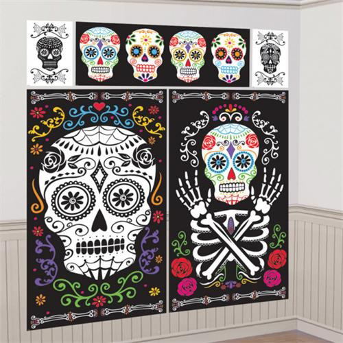 Halloweenská dekorace na zeď - Day of the dead 5 ks. Set 5 halloweenských dekorací na zeď, které přemění váš domov na pravou strašidelnou pevnost. Každá dekorace je inspirována mexickým svátkem "Día de Muertos" a je plná živých barev a detailů, které dodají vaší výzdobě ten pravý halloweenský nádech vaší party. Sada 5 ks 2 x velký plakát , 82cm x 149cm 2 x malý plakát , 26cm x 40cm 1 x Banner, 1.1m x 40cm