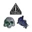 Tato sada nažehlovaček/nášivek Relikvie smrti zahrnuje vyšívané motivy Relikvií smrti, dementa a lebky Temného znamení .