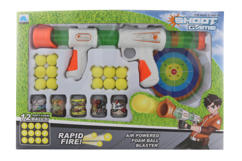 Plastová pistole na pěnové míčky. Balení obsahuje pistoli, 12 míčků, terč a 5 plastových plechovek. Rozměry pistole cca 39 x 14 cm. Rozměry balení cca 47 x 31,5 x 7,5 cm. Věk 4+