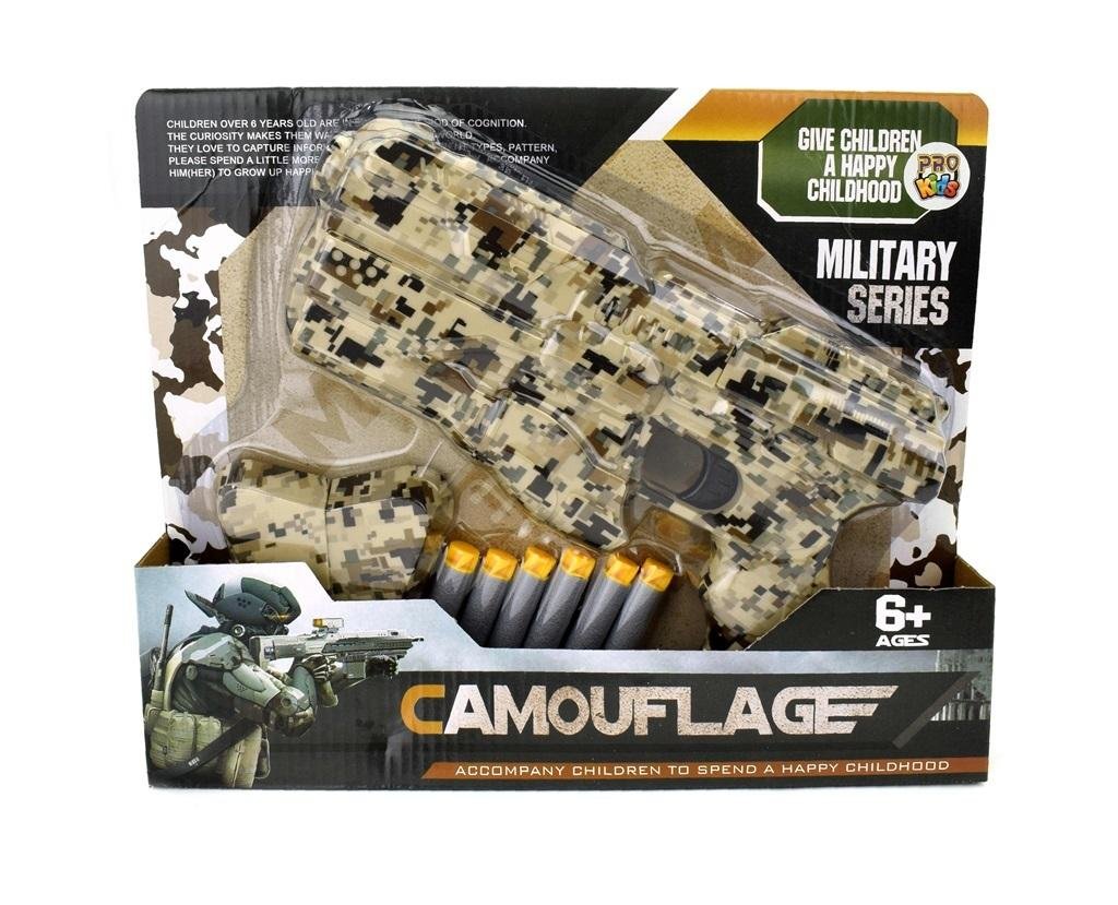 Pistolet na strzałki w unikalnym kolorze militarnym. Zestaw dla miłośnika wojska. Zabawka idealnie sprawdzi się do zabawy w terenie, gdzie kamuflaż i nauka wtopienia się w otoczenie daje niezwykłą przewagę.