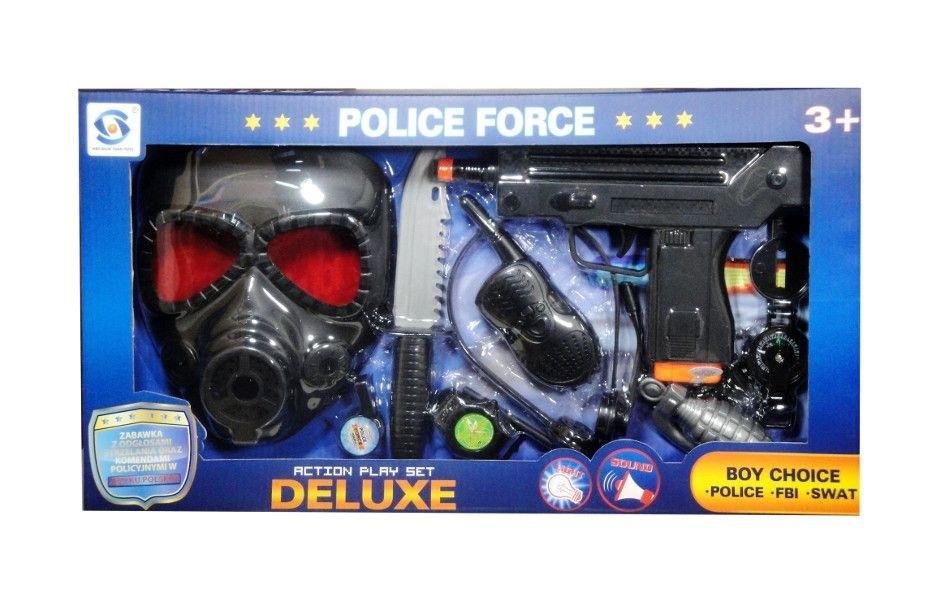 Zabawka z dźwiękami syreny policyjnej, strzelania, przeładowania broni oraz komendami policyjnymi w języku polskim.