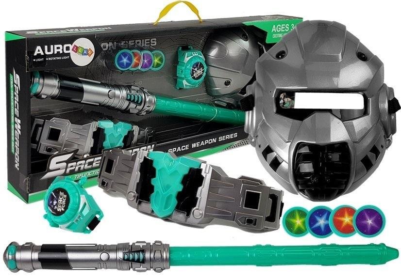 Zestaw Kosmiczny Miecz Pas Świetlny Miotacz Dysków Maska Maluch interesuje się filmami science-fiction i marzy o takim stroju jak wojownicy z kosmosu. Nasz zestaw idealnie uzupełni przebranie i pozwoli przenieś się do przestrzeni kosmicznej. Miecz wydaje efekty dźwiękowe, a dodatkowo świeci niebieskim światłem. Pas w zestawie ma z tyłu zamontowaną gumkę, dzięki której pas nie spadnie po założeniu i łatwo dopasowuje się do dziecka. Po naciśnięciu guzika od góry pasa można usłyszeć min. odgłosy strzelania i zobaczyć efekty świetlne. W ciemności razem z pasem zadziwiają efektem. Dodatkowo w zestawie znajduje się maska, po założeniu maluch będzie wyglądał jak wojownik w kosmosie. Całość zestawu utrzymana jest w kolorach czarno- srebrno- turkusowym. Miotacz dołączony do zestawu można założyć na rękę i umieścić w nim dyski i wystrzeliwać nimi do wroga. Super zestaw, dla wojownika kosmosu! Elementy zestawu: - miecz świetlny - miotacz dysków - 4 kolorowe dyski - maska - pas świetlny Wymiary elementów zestawu: - miecz świetlny: 59 cm x 5 cm x 5 cm - miotacz dysków: 8 cm x 8 cm x 5 cm - maska: 18 cm x 23 cm x 4 cm - pas: 25 cm x 8 cm x 3 cm Wymiary pudełka: 60 cm x 24 cm x 7 cm Miecz zasilany jest bateriami 3 x 1.5 V AA (brak w zestawie), natomiast pas 3 x AG13 ( w zestawie). Wszelkie elementy kosmicznego kompletu wykonane są z wysokogatunkowego materiału, czyli plastiku. Zabawka posiada certyfikat CE, zapakowana jest w duże, kartonowe pudełko ozdobione kosmicznym motywem oraz zdjęciem robota - elementy te sprawiają, że jest doskonałym pomysłem na prezent dla chłopca.