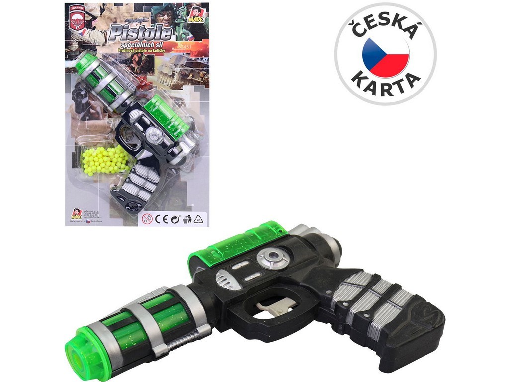 Pistole na kuličky, 18 cm, s náhradními kuličkami, 100 ksHračka je určena pro děti 3+.Rozměr hračky je 18 cm.Materiál hračky je plast.Balení hračky je blister card.Produkt je určený pro kluky. číst celé