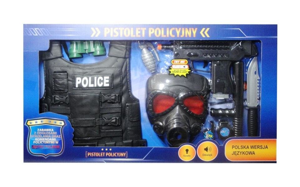 Zabawka z dźwiękami syreny policyjnej, strzelania, przeładowania broni oraz komendami policyjnymi w języku polskim: "Do wszystkich jednostek: Zgłaszam napad, ruszajmy do akcji", "Policja! Ręce do góry", "Stój, bo będę strzelał", "poddaj się, rzuć broń! Jesteś otoczony", "Jesteś aresztowany, jedziemy na komendę". W zestawie poza pistoletem znaleźć można także maskę, kamizelkę, lornetkę, nóż, kompas,gwizdek. Produkt działa na baterie typu AG10. Baterie znajdują się w zabawce.