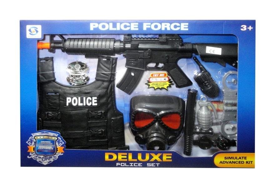 Zabawka z dźwiękami syreny policyjnej, strzelania, przeładowania broni oraz komendami policyjnymi w języku polskim: "Do wszystkich jednostek: Zgłaszam napad, ruszajmy do akcji", "Policja! Ręce do góry", "Stój, bo będę strzelał", "poddaj się, rzuć broń! Jesteś otoczony", "Jesteś aresztowany, jedziemy na komendę". W zestawie poza karabinem znaleźć można także maskę, granat, krótkofalówkę, kajdanki, kompas, odznakę, pałkę, kamizelkę. Produkt działa na baterie typu AA. Baterie znajdują się w zabawce