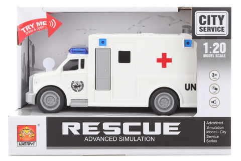 Plastová sanitka na baterie. Auto po stisknutí tlačítek na střeše svítí a vydává zvuky. Má otevírací dveře. Napájení na 3 AG13 baterie (jsou součástí. Rozměry auta cca 19 x 9 x 7 cm. Rozměry balení cca 23,5 x 15,5 x 10,5 cm. Věk 3+