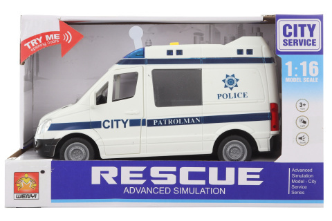 Policejní auto na baterie. Po stisknutí tlačítek vydává zvuky a svítí. Rozměry auta cca 21 x 11 cm. Rozměry balení cca 27 x 17 x 12 cm. Napájení 3x AG13 (je součástí balení). Věk 3+