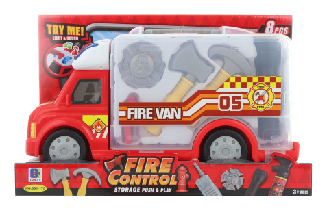 Hasičská sada obsahuje: auto se zvuky o velikosti cca 34 x 17 cm, sekeru, kladivo, svítilnu a další doplňky. Napájení na 2 knoflíkové baterie, které jsou součástí balení. Rozměr balení cca 35 x 23 x 15 cm. Věk 3+ číst celé