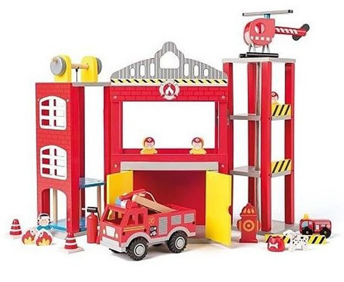 Dřevěná rozkládací hasičská stanice s příslušenstvím. Součástí je velké požární auto, figurky hasičů, helikoptéra, výtah, který lze ovládat kličkou. A hlídací pes.