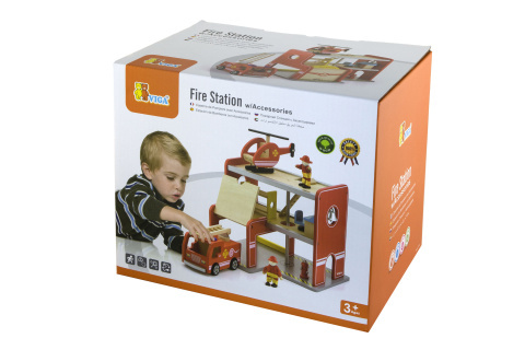Dřevěná hasičská stanice o velikosti cca 35 x 28 x 25,5 cm. Součástí balení je také hasičské auto, hydrant, helikoptéra, panáčci a další doplňky. Rozměry balení cca 36 x 30 x 26,5 mc. Věk 3+