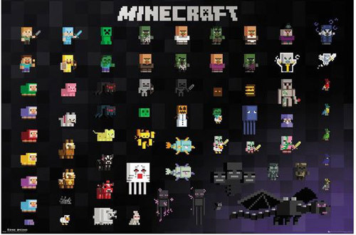Oficiální plakát z katalogu produktů s logem, obrázky a grafikou populární počítačové hry Minecraft.