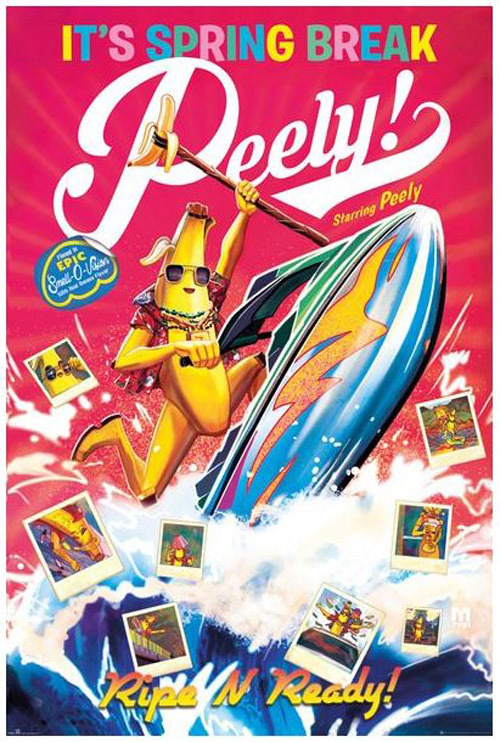 Oficiální plakát z katalogu produktů s logem a grafikou videohry Spring Break Peely.