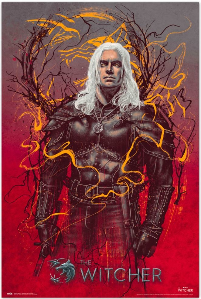 Plakát s motivem hlavní postavy jménem Gerald z dramatického seriálu The Witcher (Zaklínač).