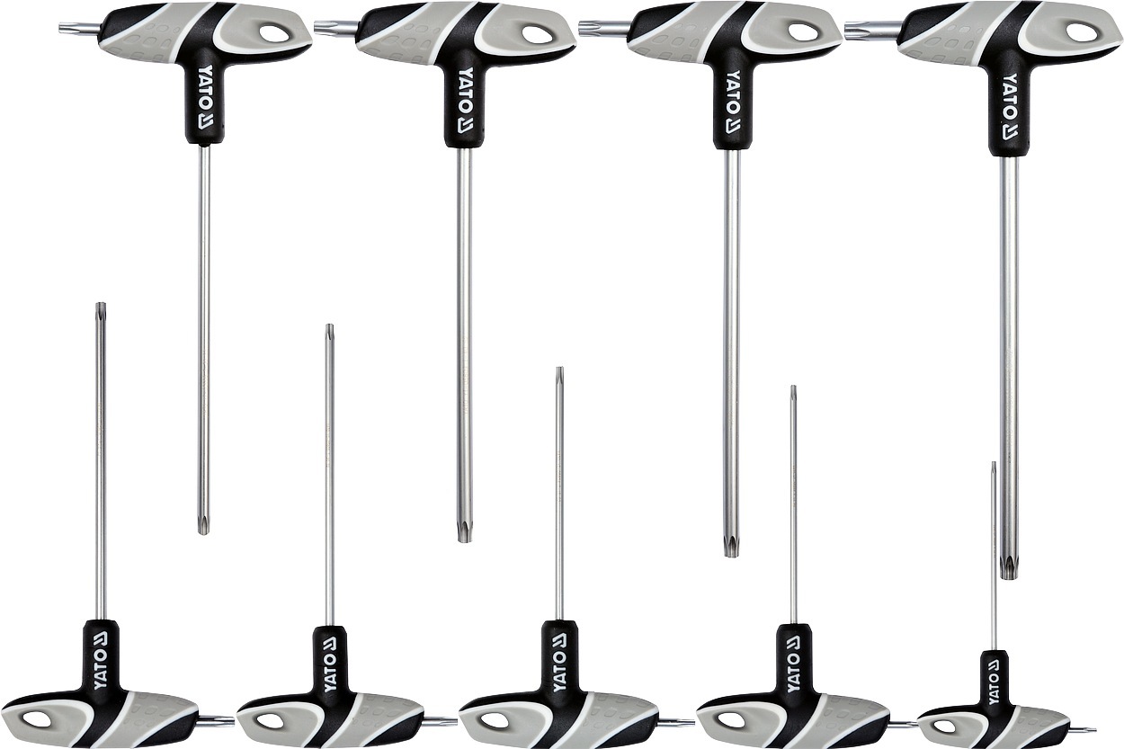 Sada klíčů v provedení T šroubovák, osazený 2x torx (hvězdička) klíčem s otvorem (1x dlouhý, 1x krátký) a ergonomickou rukojetí, díky které je jeho použití opravdu snadné. Vyrobeno z oceli S2, která zaručuje dlouhou životnost.