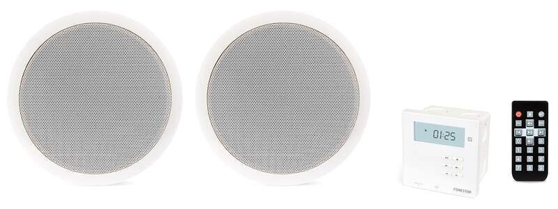 Set stěnového USB/microSD/MP3 přehrávače s LCD displejem, FM tunerem, vestavěným stereo digitálním zesilovačem o výkonu 2x 10W a dvou 6,5" stropních reproduktorů. Přehrávač obsahuje také BlueTooth pro bezdrátové přehrávání hudby z mobilního telefonu, tabletu nebo PC a 2x AUX vstupy. K přehrávači je dodáváno dálkové ovládání. Přehrávač se montuje do montážní krabičky (která je součástí balení). Je vhodný na ozvučení pokoje, kuchyně, koupelny, kanceláře, baru, restaurace nebo tělocvičny..