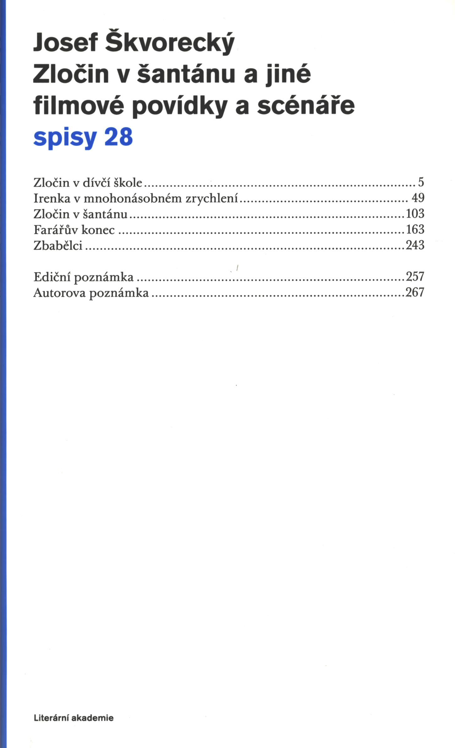 Zločin v šantánu a jiné filmové scénáře a povídky ze šedesátých let.Edičně připravuje Michal Přibáň. Bude obsahovat filmovou povídkuZbabělci a scénáře Zločin v dívčí škole (jen titulní povídku), Zločinv šantánu, Farářův konec a Irenka v mnohonásobném zrychlení. 28. svazkem Spisů Josefa...