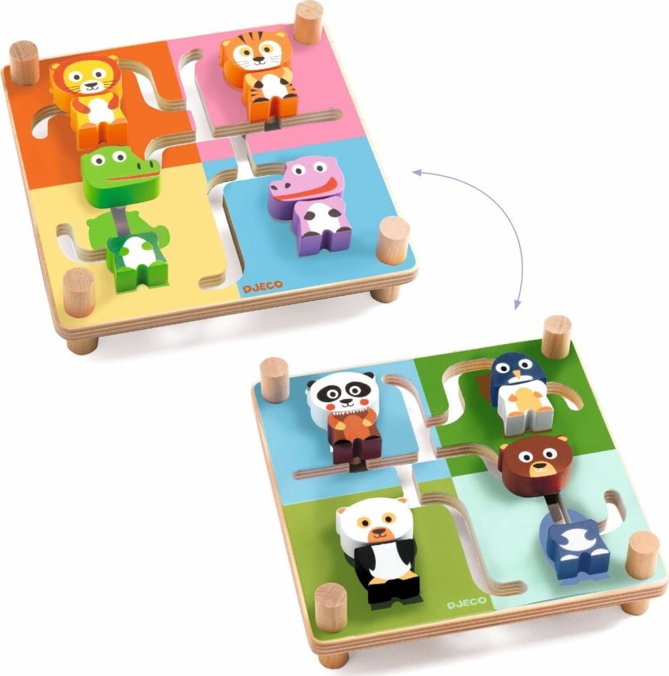 Sestavte zvířátka ze dvou částí v posuvném bludišti. Jakmile jsou 4 zvířátka složena, bludiště se obrátí a sestaví se 4 další zvířátka na druhé straně.