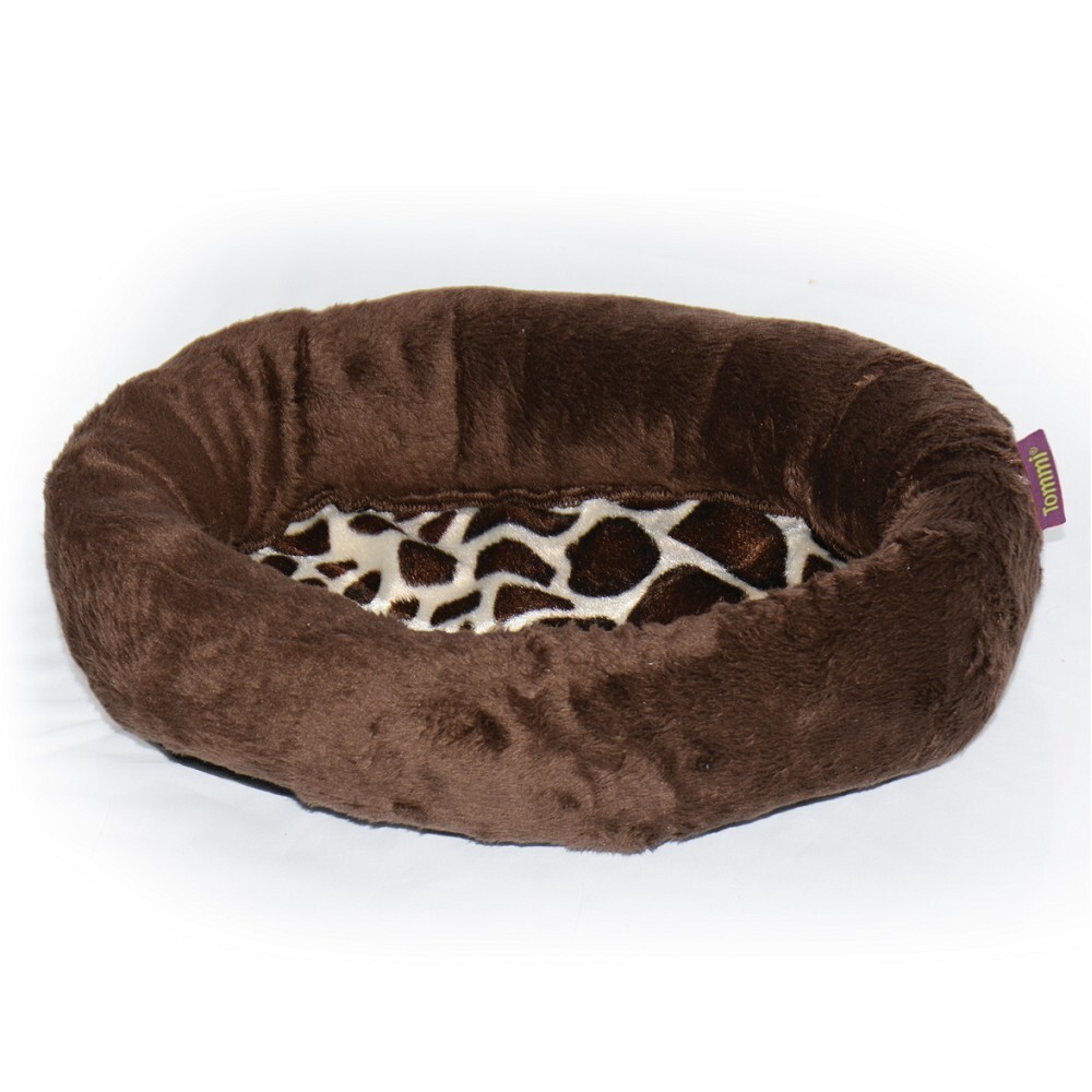 Zajímavý oválný pelíšek pro drobná zvířata- kombinace hnědého a vzorovaného plyše- vhodný jako podložka na klín při mazleníRozměr: 34 x 24 x 7,5cm (d,š,v) číst celé