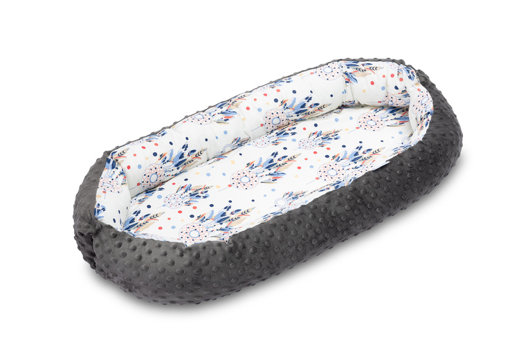 Kokon jest przeznaczony dla dzieci od narodzin do ok. 6 miesiąca życia. Posiada wygodne zapięcie na 2 napy. Podłoże stanowi wyjmowany materacyk z pianki poliuretanowej. Tkanina wierzchnia to delikatna 100% bawełna, połączona z mięciutkim minky. Wypełnienie wałka stanowią antyalergiczne kulki silikonowe. Transport i przechowywanie ułatwia dołączony do produktu trwały pokrowiec.