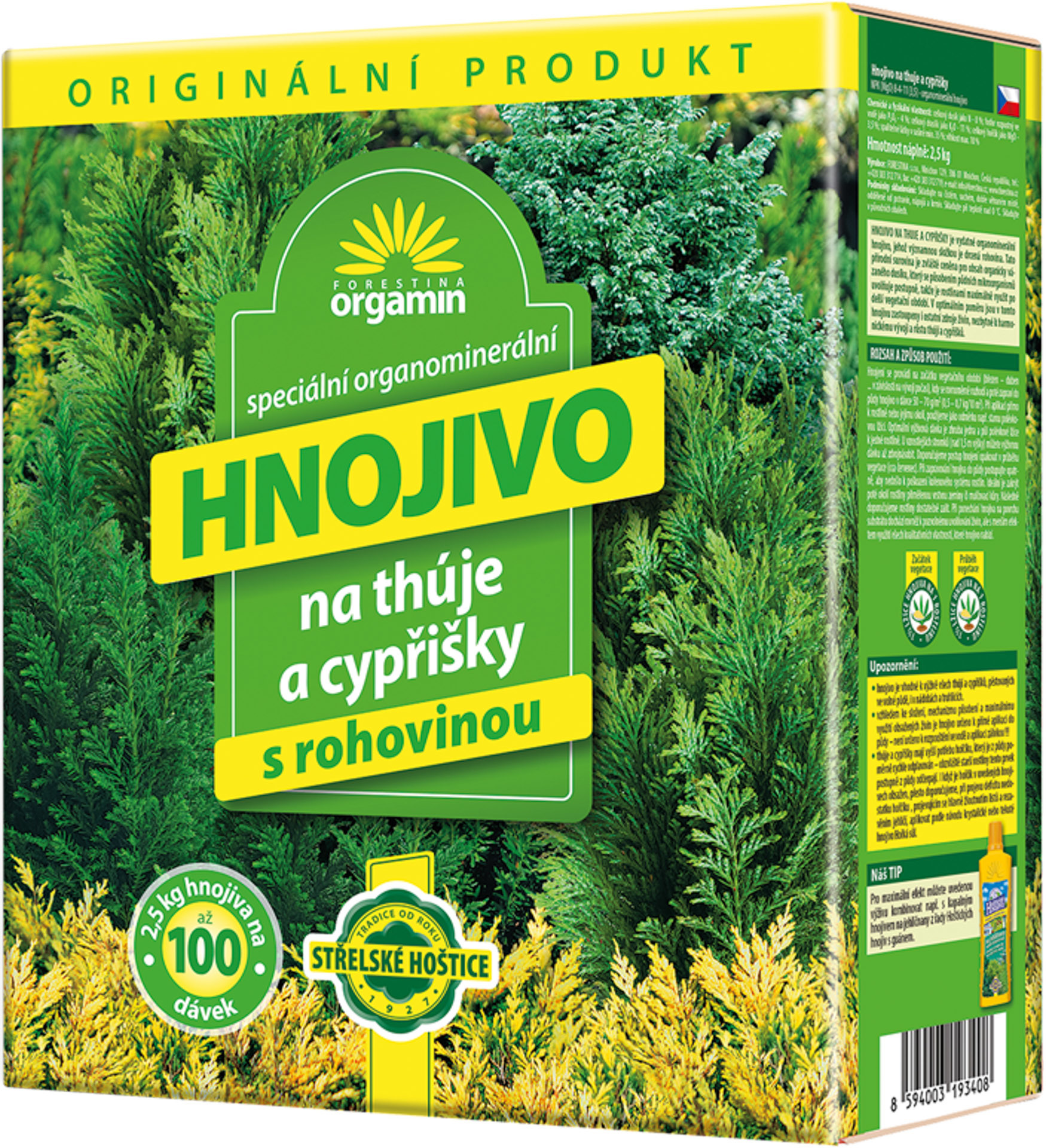 Biomin na thúje a cypřišky je vydatné, ekologicky příznivé organicko-minerální hnojivo, jehož významnou složkou je drcená rohovina. Tato přírodní surovina je zvláště ceněna pro obsah organicky vázaného dusíku, který se působením půdních mikroorganismů uvolňuje postupně, takže je rostlinami maximálně využit po delší vegetační obobí. V optimálním poměru jsou v tomto hnojivu zastoupeny i ostatní zdroje živin, nezbyté k harmonickému vývoji a růstu thújí a cypřišků.