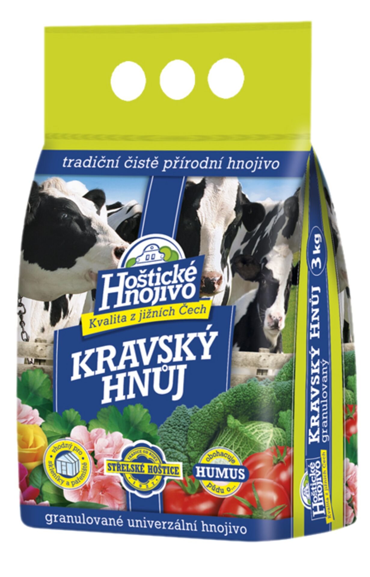 Hoštický kravský hnůj obsahuje vyvážené množství hlavních živin - dusík (N 1,5 %), fosfor (P 2,5 %) a draslík (K 3 %), které jsou nezbytné pro růst a plodnost rostlin. Je vhodný pro široké spektrum použití, od základního hnojení zeleniny, jako jsou celer, kapusta či rajčata, až po podporu květu a růstu okrasných rostlin, jako jsou růže nebo trvalky. Granule při kontaktu s vodou bobtnají, což zajišťuje postupné uvolňování živin do půdy, a tím zvyšují účinnost hnojení.