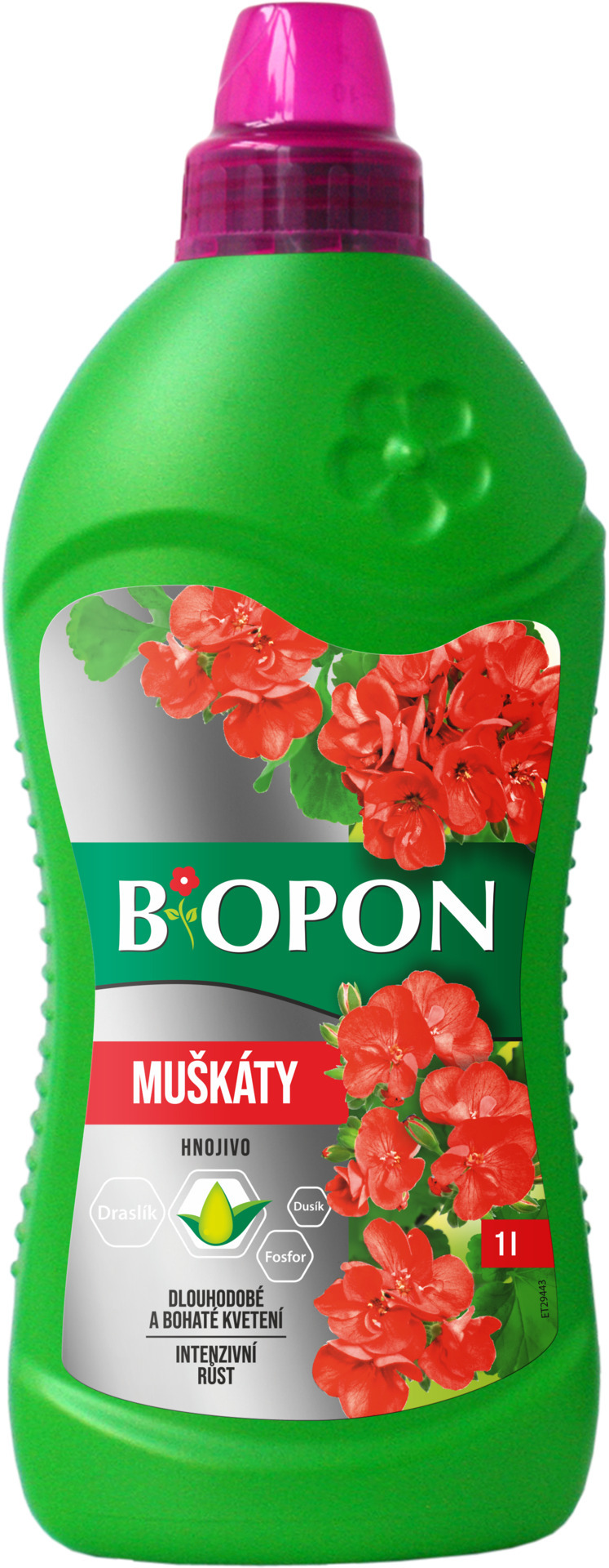 Biopon pro pelargonie je vícesložkové minerální hnojivo určené pro všechny varianty pelargónií. Obsah dusíku v amidové formě prodlužuje účinnou dobu. Proto rostliny nemusí být hnojeny denně. Optimálně vybírané množství draslíku rostliny povzbuzuje k bohatému květu.