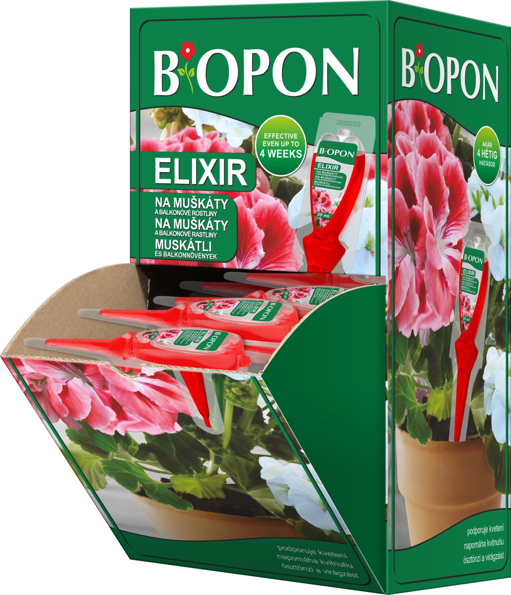 Bopon Elixír je inovativní hnojivo, které přináší vašim rostlinám všechny potřebné živiny po dobu až 4 týdnů díky praktickému aplikátoru. Užijte si syté barvy květů a zdravé, výrazně zelené listy bez složitého dávkování.