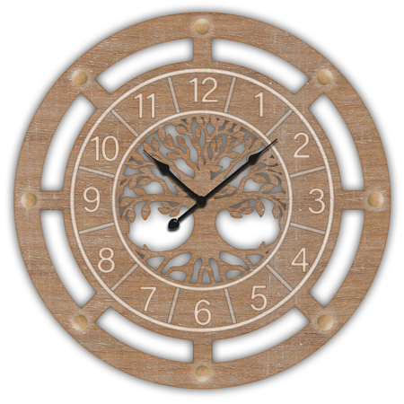 Tyto kruhové nástěnné hodiny s průměrem 60 cm kombinují elegantní design s praktickým využitím. Uprostřed ciferníku je umístěn symbolický strom života, kolem nějž jsou rozmístěny arabské číslice. Celkový tvar hodin připomíná dřevěné kormidlo, což jim dodává osobité kouzlo. Vyrobené jsou z MDF desky v hnědé barvě s černými ručičkami. Tyto hodiny přinášejí do vašeho prostoru unikátní kombinaci přírodního vzhledu a netradičního designu.