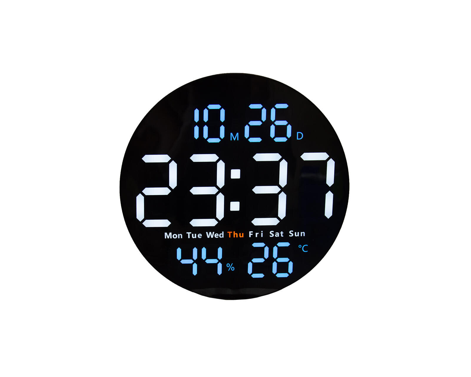 Nástěnné digitální hodiny s průměrem 25 cm kombinují jasný LED displej s velkými arabskými číslicemi, které zajistí perfektní čitelnost i z dálky. Díky přehlednému zobrazení data i dne v týdnu v angličtině budete mít vždy přehled o aktuálním dni. Součástí je i zobrazení teploty a vlhkosti, které umožňuje sledovat prostředí ve vašem domově či kanceláři.