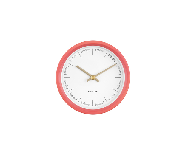 Nástěnné hodiny v korálově růžové barvě s bílym ciferníkem.