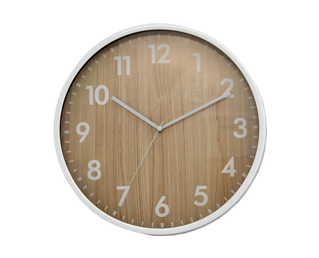 Hodiny jsou vyrobeny z kvalitních materiálů - kombinace plastu, kovu a skla zaručuje odolnost a dlouhou životnost produktu. Bílý rám a podklad s imitací dřeva tvoří nadčasový design, který se hodí jak do moderních, tak do klasických interiérů. Přehledná bílá čísla usnadňují čtení času z větší vzdálenosti. Díky univerzálnímu vzhledu je možné hodiny umístit téměř kamkoliv - do obývacího pokoje, kuchyně, kanceláře či dětského pokoje.