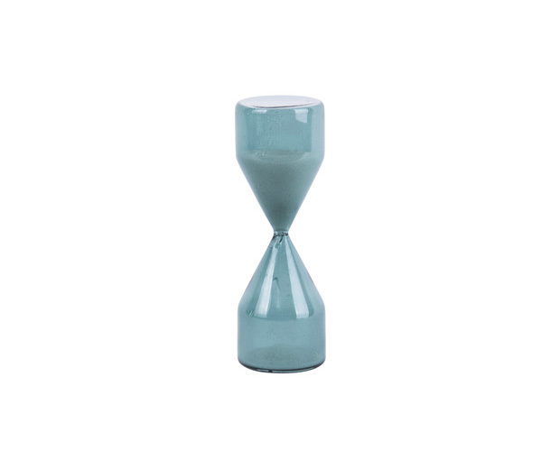 Skleněné přesýpací hodiny v zelené barvě s bílým pískem.