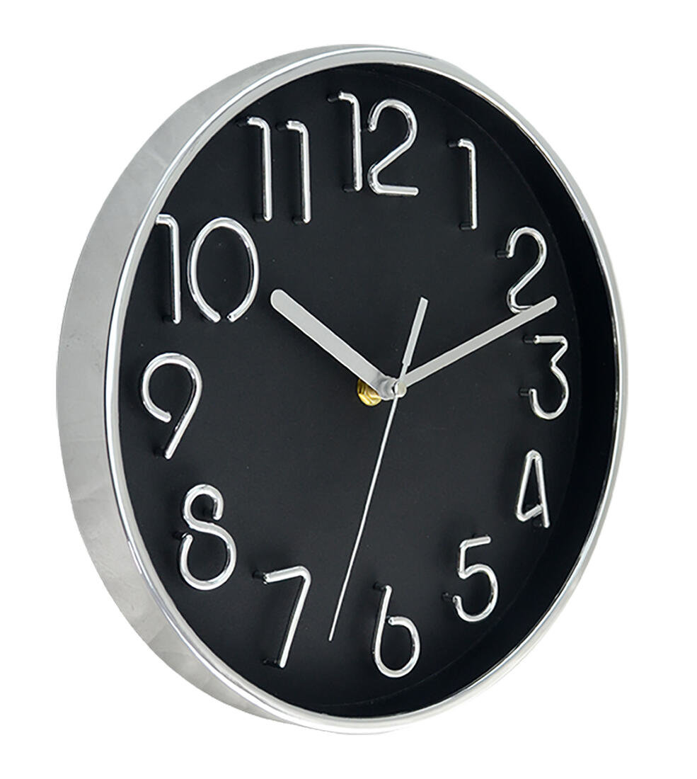 Elegantní kombinace stříbrného rámu a černého podkladu s 3D ciferníkem zajišťuje skvělou čitelnost i z větší vzdálenosti. Hodiny mají průměr 30,5 cm a díky kvalitnímu provedení z plastu, kovu a skla působí moderně a odolně. Univerzální barevné provedení stříbrné a černé padne do většiny interiérů, ať už chcete doplnit obývací pokoj, kancelář nebo kuchyň.