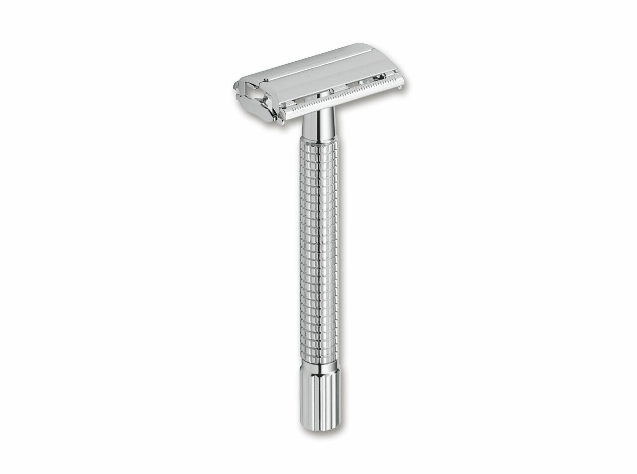 Holiaci strojček/žiletka Böker Butterfly L Chrome Rasierhobel s motýľovým mechanizmom pre ľahkú výmenu čepele. Otočením konca rukoväte sa hlavica žiletky otvorí a získate prístup k čepeli. S dlhšou rukoväťou.
