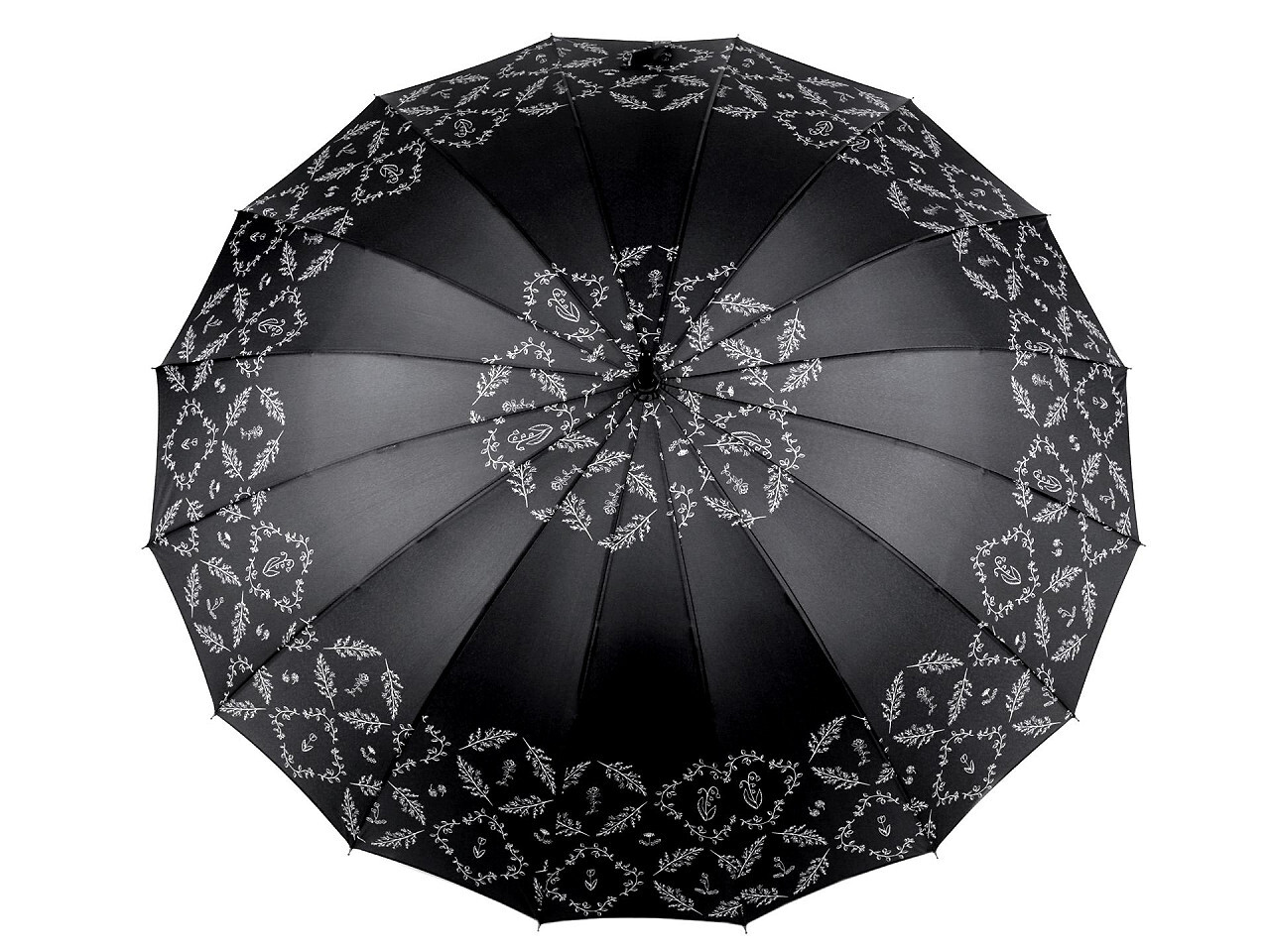 Dámský vystřelovací deštník s jemným vzorem větviček a květů vás spolehlivě ochrání před nepřízní počasí. Skládá se z 16 výsečí, díky kterým se deštník řadí mezi luxusní kousky. Konstrukce je vyrobená z kovových drátů a pružných lamel zajišťujících vysokou pevnost a stabilitu, deštník se neohne ani za největšího nečasu. Má klasickou tyč zakončenou pevnou rukojetí.